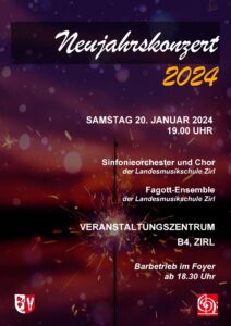 Die Landesmusikschule Zirl lädt zum Neujahrskonzert 2024, Samstag 20. Jänner 2024 – 19.00 Uhr ein.